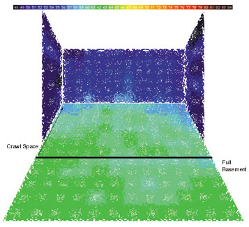 Dining Room - Surface temperatures of the floor and glazing. The graph is keyed by color, where each change in hue represents a one degree change in temperature (° F). Surface temperatures were recorded at 12" intervals across the floor and the glazing. The black line indicates the area below the floor where the foundation of the full basement ends and the unexcavated crawlspace begins. Surface temperatures in the dining room are almost ten degrees cooler at the glazing, though there is a cold shadow falling on the floor immediately below the windows, which is caused by the cold air next to the glass falling the the floor in the absence of the fully functional heating system.
