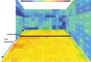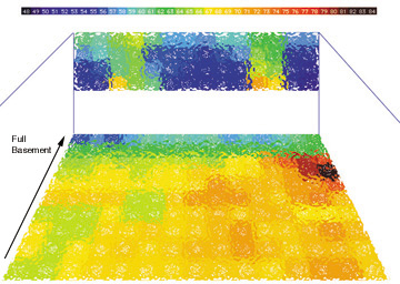 Living Room - Surface temperatures of the floor and glazing. Color changes indicate one degree changes in temperature, and the readings were taken at 12" intervals. Like the image of the dining room, the black line indicates the location of the crawlspace beneath the floor. This room has a large glazed area, as can be seen in the diagram, though the overall temperature of the glass is higher than that of the dining room, it is still cooler than the floor temperatures.