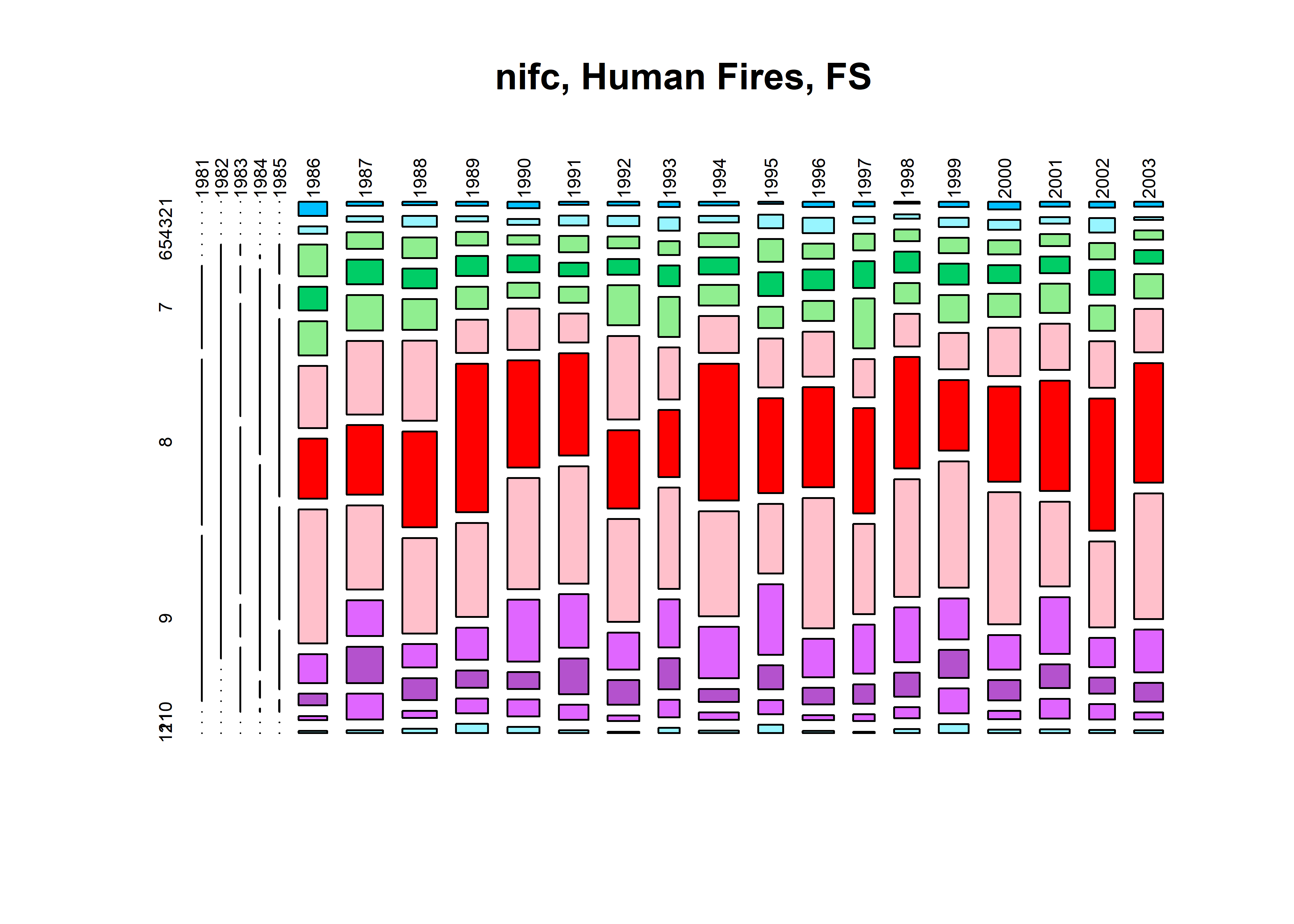 mosaicplot(nifc.tablemon, color=monthcolors, cex.axis=0.6, las=3, main="nifc, Human Fires, FS")