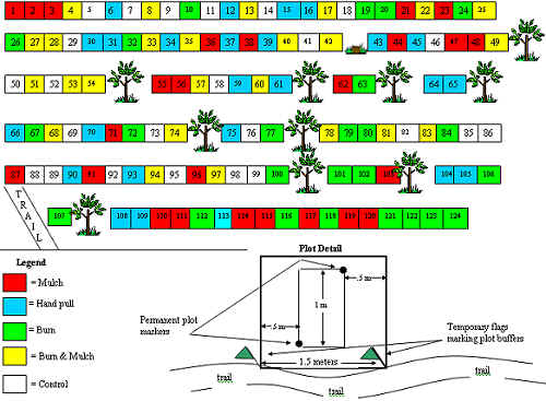 Treatment StudyIntroduction: The Hendricks Park Secondary Invasive Plant Management Study is designed to evaluate the effectiveness of 4 different management protocols for controlling the spread of Herb Robert and Nipplewort. There are 124 plots in the study. Each is 1.5 meters wide and 1.5 meters long. Each of the 4 treatments - hand pulling, mulching, burning, mulching and burning ö and the control are replicated 25 times and are randomly distributed. The data below shows initial results of early stem counts. Plot dimensions ö Each plot is 1 meter long by .5 meters wide. Diagonal corners of the plot are permanently marked with a metal nail and washer pounded into the ground. Plots are nested inside a buffer area. See illustration at bottom of treatment map. Edge Plot Treatment Map ö Two sites were chosen in the park where Herb Robert and Nipplewort are present, a 25 plot section alongside a closed road within the park's forested area and 99 plots along a nearby intersecting trail. The map below illustrates the four treatment methods applied to the monitoring plots and it will be used as reference for future plot work.