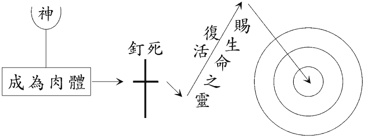 神‘成了’肉体,降生为人,称为耶稣。‘话成了肉体,支搭帐幕在我们中间。’(一14。)主‘成了’那灵,从死复活,成为赐生命的灵。‘末后的亚当成了赐生命的灵。’(林前十五45下。)这个灵既是‘赐生命的灵’,就带着生命,把神分赐到相信祂的人里面。