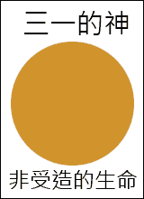我们要看见非受造的生命是无始无终的,是自己存在的,永不改变的。我们可以画一个图来表明这生命。顶自然的,大家会题议画一个圆圈。最好领查经班的人,能够照着本书所附的图样,制成一套,以资应用。制法可以用白纸板一张,长十四寸,阔十一寸,其上贴金色圆形纸一张,上面写上‘三一的神’下面写上‘非受造的生命’。