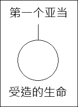 讲到这里的时候,可以用一块白纸板,其大小和那表明‘非受造’生命的一块相等。纸板上画一条直线,从稍微离开顶端一些的地方,一直画下来,接着画一个小圆圈。直线以上写‘第一个亚当’,小圈以下写‘受造的生命’。(请看第二图。)