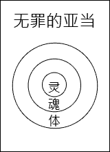 这三部分构成的人,我们可以在纸板上画三个圆圈来表明。在最里的圈内写一个‘灵’字,在中间的圈内写一个‘魂’字,在外圈内写一个‘体’字。(看第三图。)