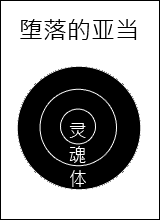 死既然进入第一对人的灵里,不久就整个‘里面的人’都死了。再过了若干时候,身体也死了。(这身体,如果他们能一直倚靠神,本可不死的。)神用尘土所造的身体,是造得非常奇妙的。它本来可以得着荣耀,但现在仍然归回尘土了。我们可以用一张黑色的圆形纸,纸上画上三个圆圈(代表灵、魂、体)罩在白圈上。(如第四图。)