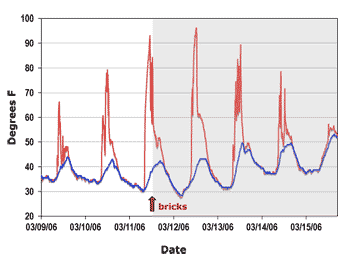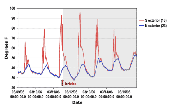 Outdoor temperatures were monitored in both north (front porch; Hobo 23) and south (covered balcony; Hobo 16) positions during the experimental period in March. High temperatures reached on the balcony are thought to have resulted from direct sun, indicating qualitative potential for solar gain through the south windows below.