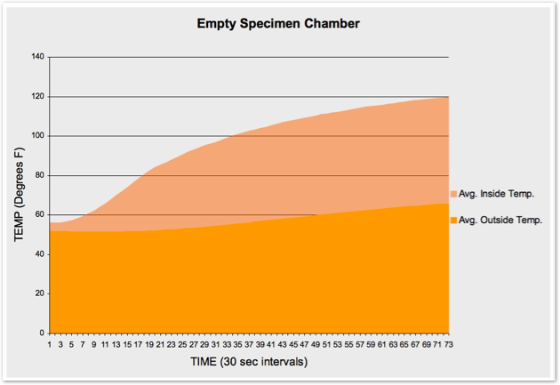 Based on the heat flow through an empty chamber, we were able to establish a constant to make accurate comparisons. This test allowed us to calculate a baseline temperature differential between the innermost HOBO sensor and the outermost, cross-referenced to the ambient air temperature of the testing environment (a garage). As with all the other subsequent tests, the Raytech was used at the end of the test period to verify the last readings on the HOBOs log.