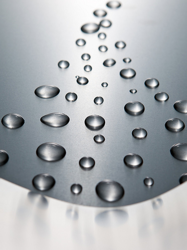 We know what we mean when we say something is a solid. We recognize a bar of lead and a rock (olivine) are solids, and that soft drinks, the oceans, and rivers are liquids, and so on. In general terms, we recognize that solids are rigid and/or malleable structures while liquids can flow. (Recall the comment about amorphous solids in this case; Are amorphous solids, solids or liquids?)In this Chapter, we consider how liquids differ from solids, in a physical sense, and some properties of liquids in everyday life. In the top left we see two examples of water (the molecule composed of two hydrogen atoms and one oxygen atom, H2O). To the left, the bottom compares two forms of water. The right hand model shows the well-structured solid form of water, ice, and the left hand model shows a more disorgainized collection of water molecules, a liquid. Interestingly, water expands when it goes from liquid to solid and liquid water has a density of 1 gram per cubic centimeter (1 gram per sugar cube) while solid water (ice) has a density of 0.92 grams per cubic centimeter (0.92 grams per sugar cube)! Solid water is less dense than liquid water which, as we point out later, means that ice floats in liquid water (see the iceberg to the left). |