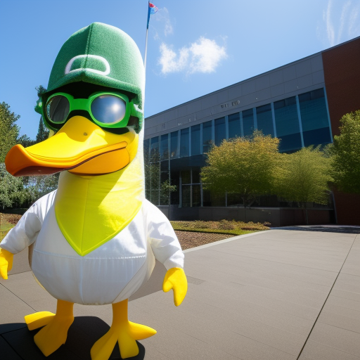 The University of Oregon's mascot, Puddles the duck, standing in front of the Knight-Campus research building. The duck is wearing a lab coat and safety goggles.