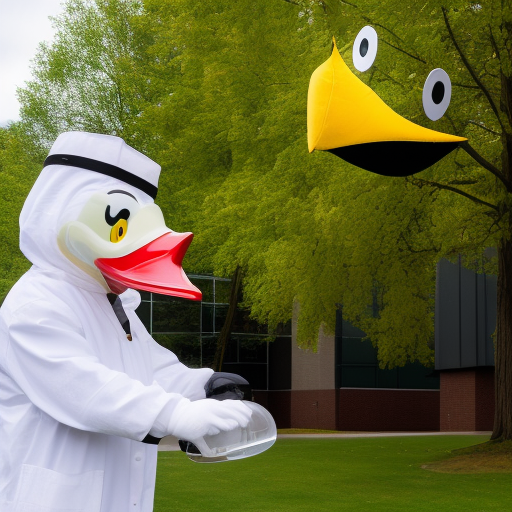 The University of Oregon's mascot, Puddles the duck, standing in front of the Knight-Campus research building. The duck is wearing a lab coat and safety goggles.