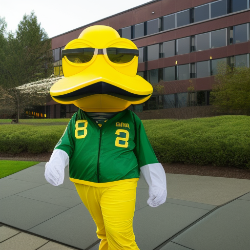 The University of Oregon's mascot, Puddles the duck, standing in front of the Knight-Campus research building. The duck is wearing a lab coat and safety goggles.