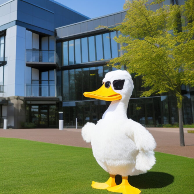 The University of Oregon's mascot, Puddles the duck, standing in front of the Knight-Campus research building. The duck is wearing a lab coat and safety goggles.