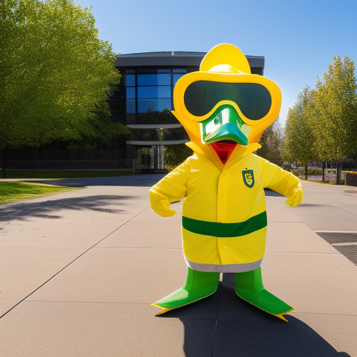 The University of Oregon's mascot, Puddles the duck, standing in front of the Knight-Campus research building. The duck is wearing a lab coat and safety goggles.