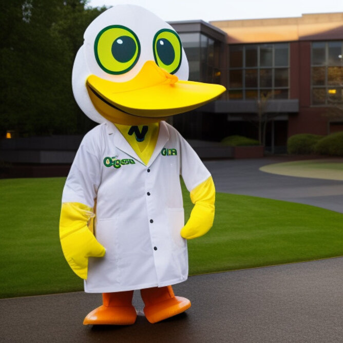 The University of Oregon's mascot, Puddles the duck, standing in front of the Knight-Campus research building. The duck is wearing a lab coat and safety goggles.
