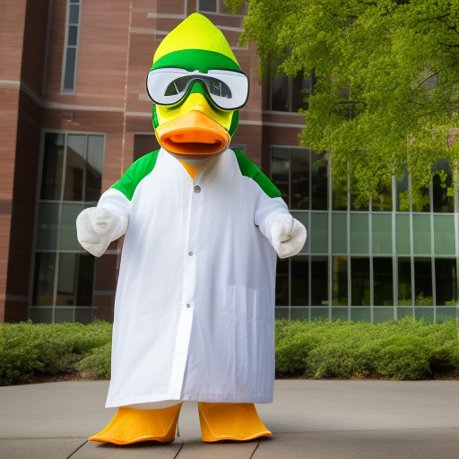 The University of Oregon's mascot, Puddles the duck, standing in front of the Knight-Campus research building. The duck is wearing a lab coat and safety goggles.