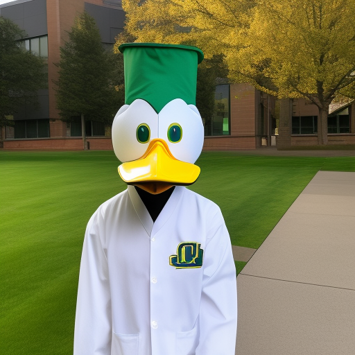 The University of Oregon's mascot, Puddles the duck, standing in front of the Knight-Campus research building. The duck is wearing a lab coat and safety goggles.