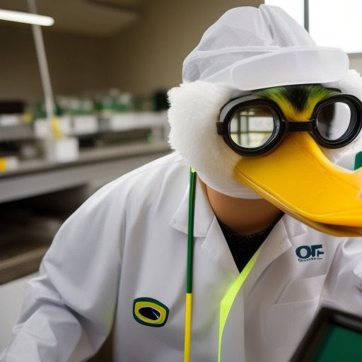 The University of Oregon's mascot, Puddles the duck, working in a bioengineering lab. The duck is wearing a lab coat and safety goggles.