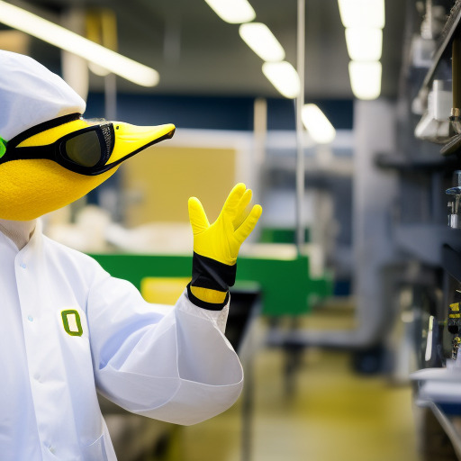 The University of Oregon's mascot, Puddles the duck, working in a bioengineering lab. The duck is wearing a lab coat and safety goggles.