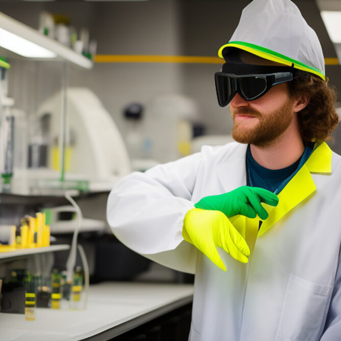 The University of Oregon's mascot, Puddles the duck, working in a bioengineering lab. The duck is wearing a lab coat and safety goggles.