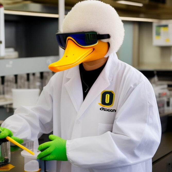 The University of Oregon's mascot, Puddles the duck, working in a bioengineering lab. The duck is wearing a lab coat and safety goggles.