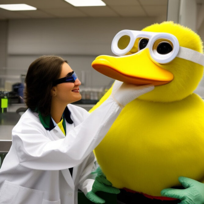 The University of Oregon's mascot, Puddles the duck, working in a bioengineering lab. The duck is wearing a lab coat and safety goggles.