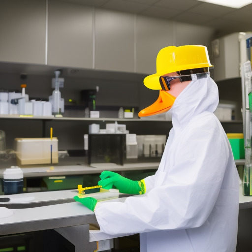 The University of Oregon's mascot, Puddles the duck, working in a bioengineering lab. The duck is wearing a lab coat and safety goggles.