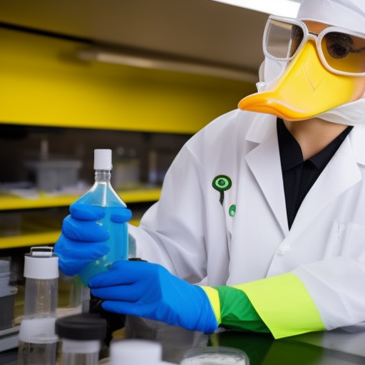 The University of Oregon's mascot, Puddles the duck, working in a bioengineering lab. The duck is wearing a lab coat and safety goggles.