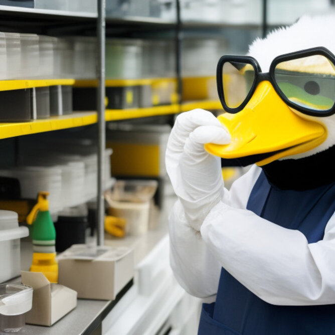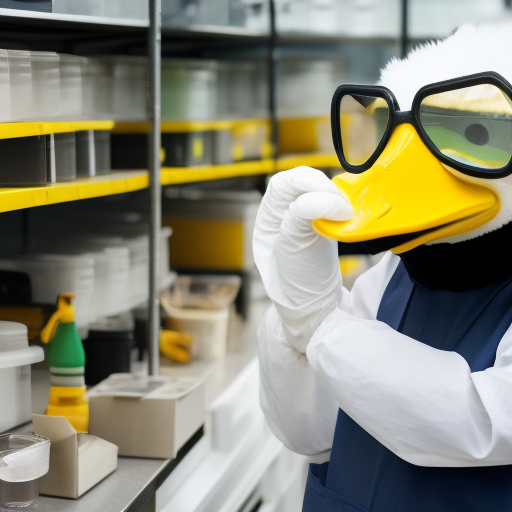The University of Oregon's mascot, Puddles the duck, working in a bioengineering lab. The duck is wearing a lab coat and safety goggles.