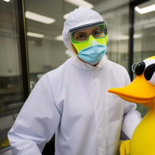 The University of Oregon's mascot, Puddles the duck, working in a bioengineering lab. The duck is wearing a lab coat and safety goggles.