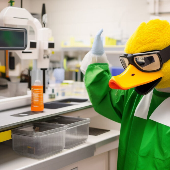 The University of Oregon's mascot, Puddles the duck, working in a bioengineering lab. The duck is wearing a lab coat and safety goggles.