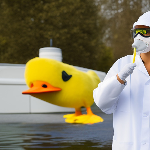 The University of Oregon's mascot, Puddles the duck, working in a bioengineering lab. The duck is wearing a lab coat and safety goggles.