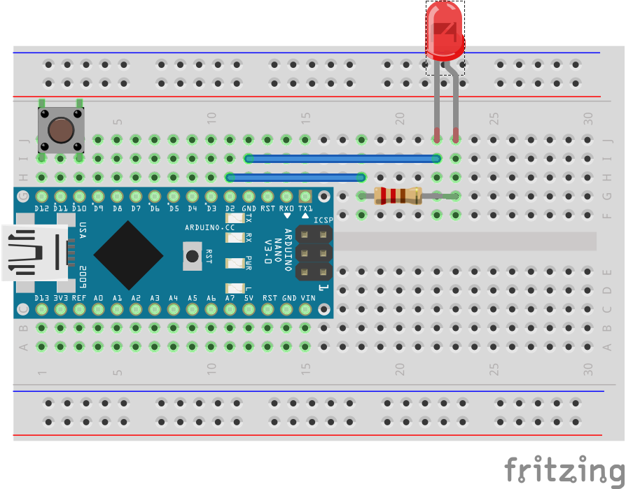 This task will introduce simple digital input and output (I/O) with a button and an LED. The first step is to put your Nano into your breadboard. Check the wiring diagram below and try to put the Nano in exactly this position. As space on our breadboard is in short supply, it is important to place the Arduino at the very end of the breadboard with the USB connection accessible. Inserting the Arduino takes a fair amount of force, and removing it is even more difficult, so we only want to do this once. When inserting the board, try to push on the edges of the board, and don't apply force to the ATMega chip itself.