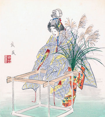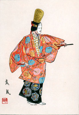 Sôfû was involved in a major twentieth century innovation in nô texts. In 1929, he drew the illustrations for the Kanze School’s Kanze-ryû Shôwaban, nô play texts published by the Kanze School of nô. In 1937, with the publication of the Kanze-ryû Taiseiban Utaibon, Kanze Sakon, the head of the Kanze School, and Sôfû revolutionized nô texts by introducing line-drawing illustrations onto the pages of the texts.