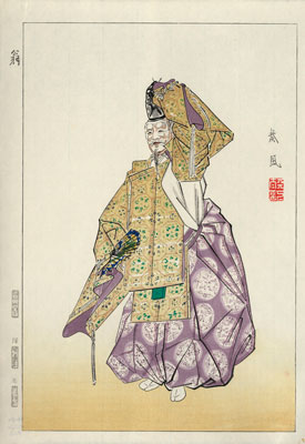 Matsuno Sôfû was born in 1899 in Shitaya in working class Tokyo, only a few miles to the north of Kôgyo’s [Tsukioka Kōgyo (1869-1927)] birthplace in Nihonbashi. At age twelve, while a first year middle school student, Sôfû began the study of painting with Odake Kokkan, a wellknown painter of historical subjects. Two years later in 1914, he dropped out of school to apprentice with Kôgyo. In 1915, Sôfû entered his first painting, of the nô play Hagoromo, in a competition, and in 1916, his painting of the fourteenth century warrior Nitta Yoshisada won him, while still a teenager, his first prize in a painting exhibition. In 1920, shortly after the end of World War I, Sôfû was drafted into the military and served in the elite First Konoe Infantry Regiment, stationed near the Imperial Palace in Tokyo. After leaving the army in 1921, Sôfû began, with recommendations from the artists Yamazaki Gakudo and Sakamoto Setchô, to publish nô pictures seriously and received positive reviews. He also produced woodblock prints. In the late 1920s, after Kôgyo’s death, for example, Sôfû created 27 woodblock prints to complete Kôgyo’s Nôga taikan.