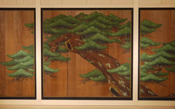 Sôfû not only produced paintings and prints of nô subjects, but also in 1927 he painted his first of what would be a number of pine tree backdrops for nô stages: this first was in a private home of a former high-ranking retainer of the daimyô of Sendai, and ironically done in the same year that his mentor Kôgyô died of lead poisoning while painting a pine tree backdrop on a stage in the city of Utsunomiya. After World War II, Sôfû painted the pine and bamboo trees on the back of stages at Hakusan Shrine, the Shintô affiliate of Chûsonji Temple at Hiraizumi in Iwate Prefecture, at the Yamamoto nô stage in Osaka, the Kawamura nô stage in Kyoto, and a temple in Kameoka. In December 1958, Sôfû suffered a stroke while painting a pine backdrop for a stage in Osaka—he recovered, but died of another stroke four years later.